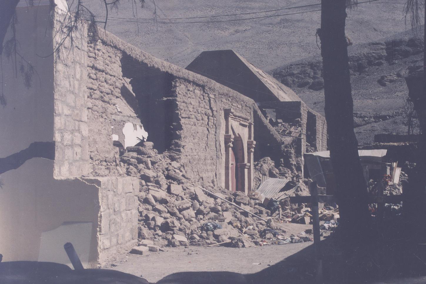 Detalle de la portada de la iglesia en el que aparece el muro pintado de blanco, la puerta es arqueada, rodeada de relieves con motivos florales de gran tamaño, encima del arco se encuentra la figura de un ángel. Está ubicada en la provincia de Iquique, Quebrada de Camiña, a 2.200 m. de altura, I Región, construída con muros de adobe. En las fotos del 2008 está destruída.